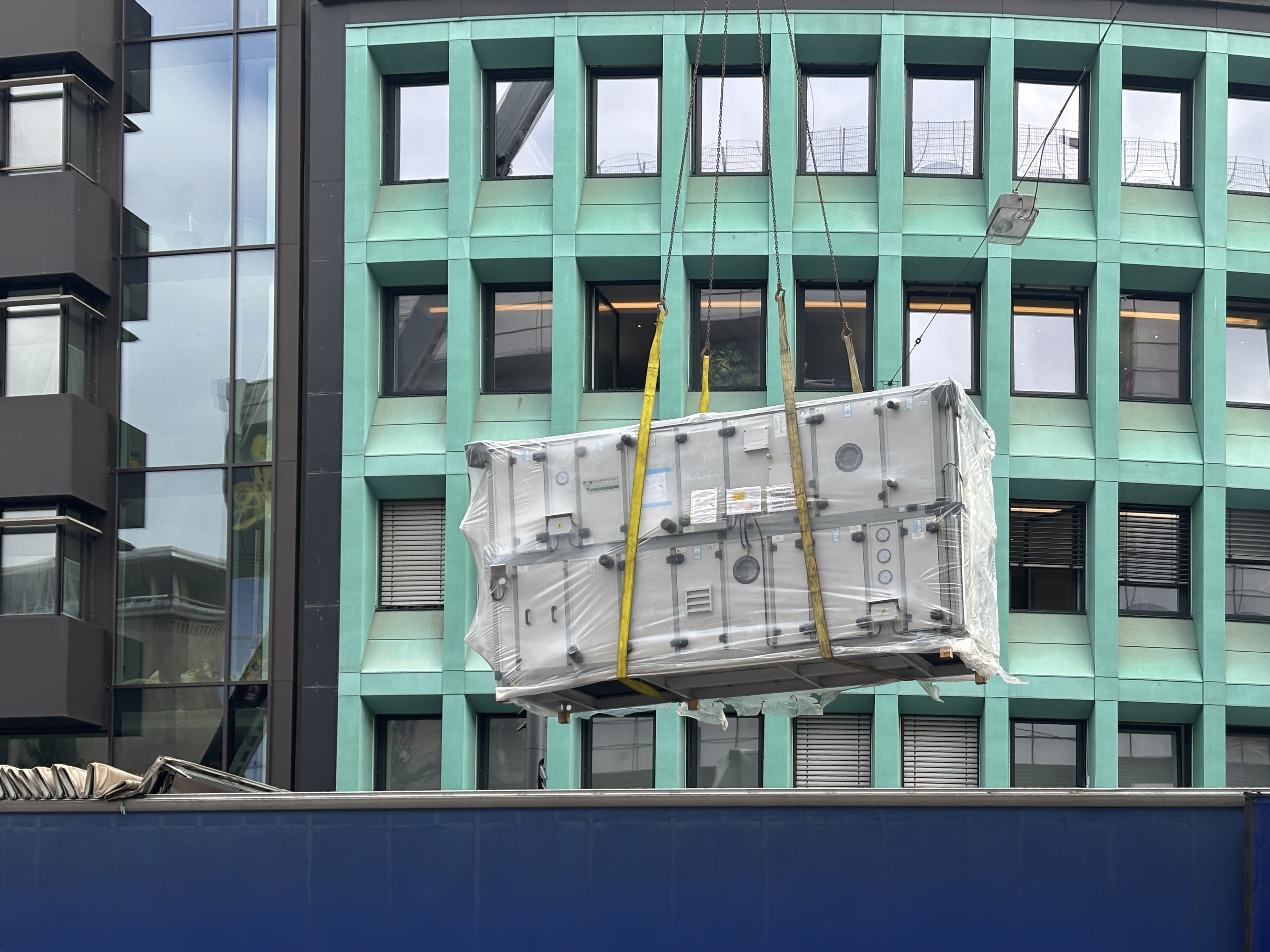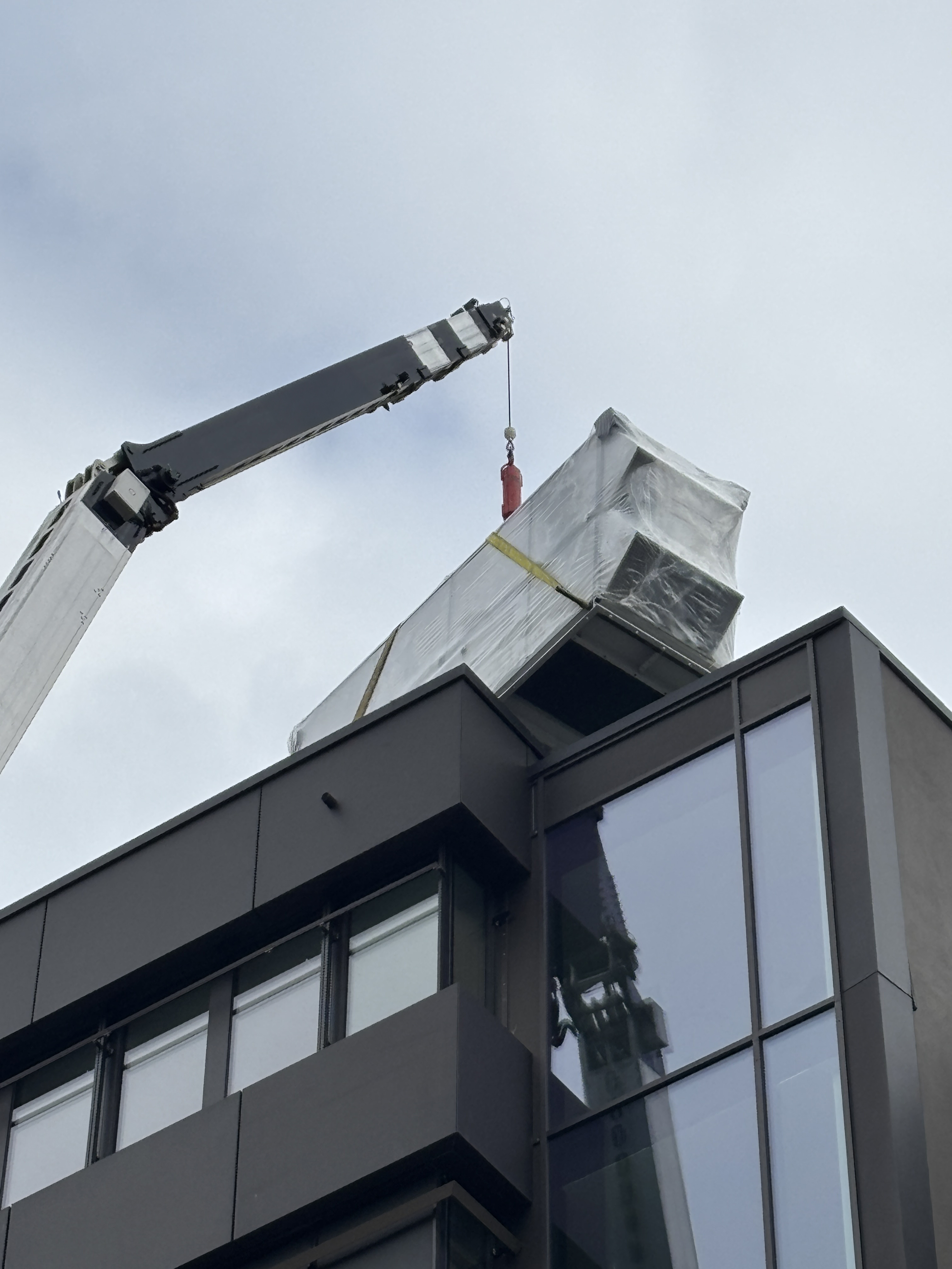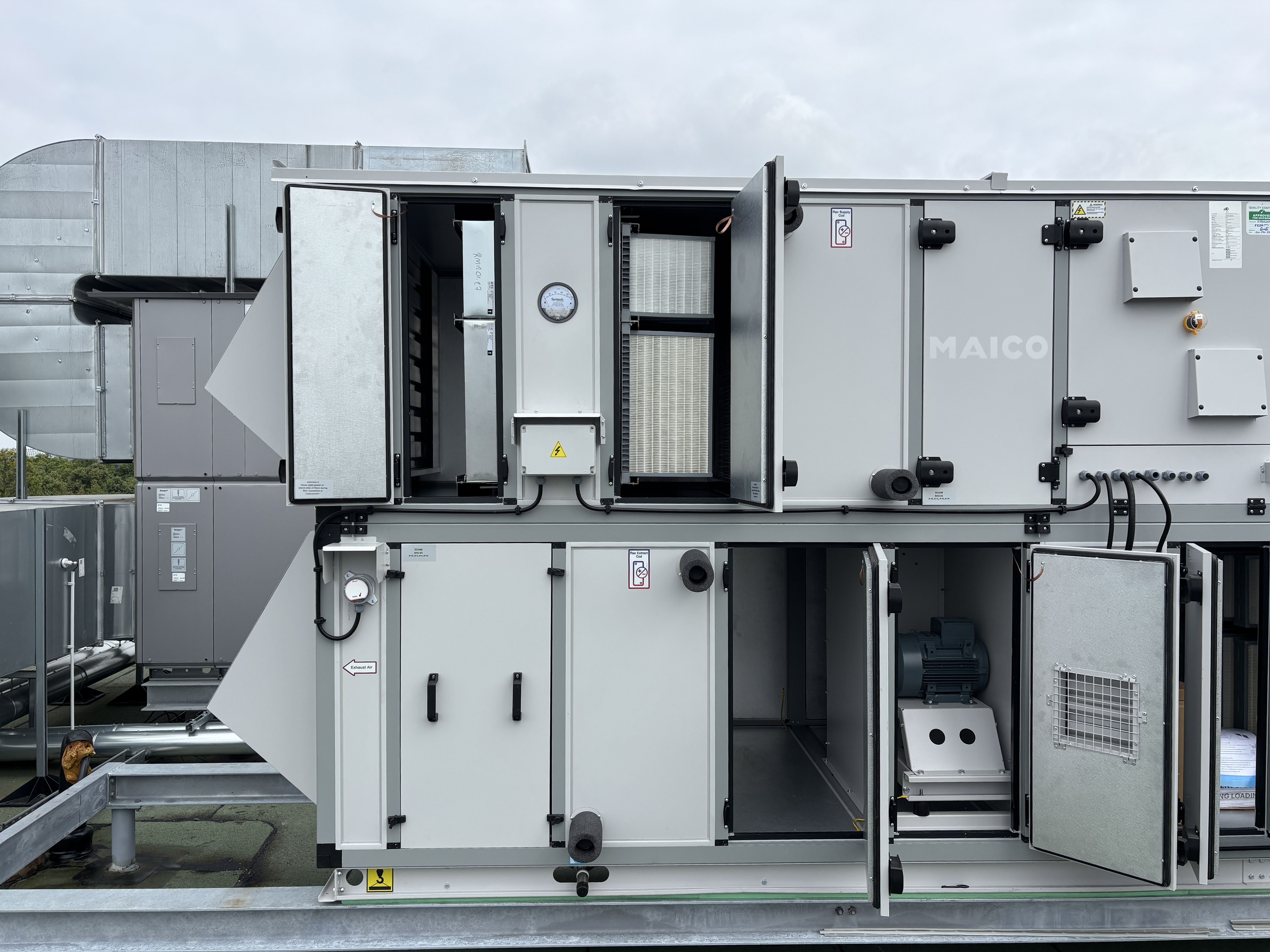 Die AHU wurde auf dem Dach des Gebäudes installiert und zuvor als vormontierte, vollständig verdrahtete Anlage per Kran direkt auf das Dach gehoben – ein logistisches Highlight, das durch die reibungslose Zusammenarbeit aller Projektpartner ermöglicht wurde. Die finalen Installationsarbeiten wurden gemeinsam mit unseren lokalen Partnern erfolgreich abgeschlossen.
